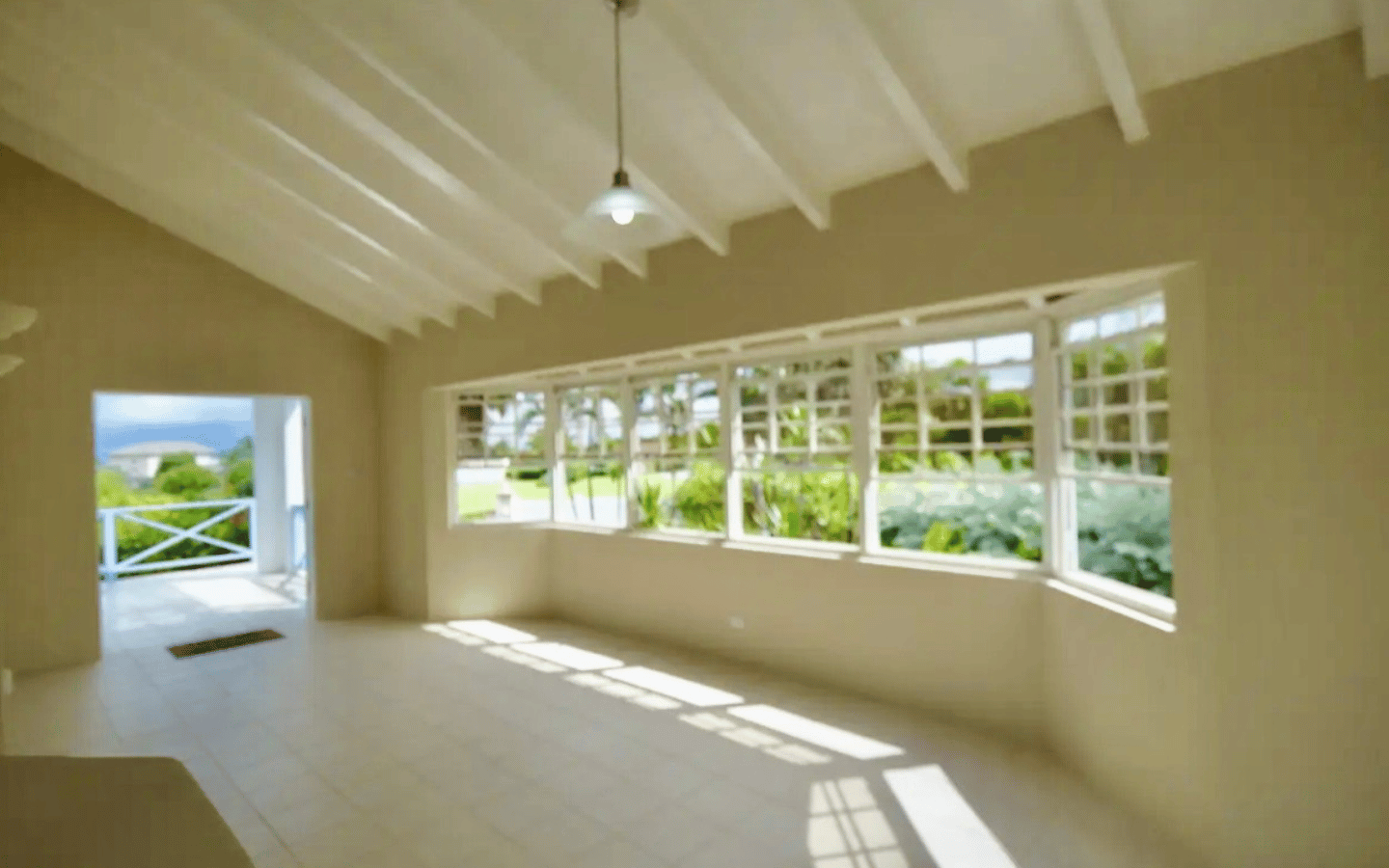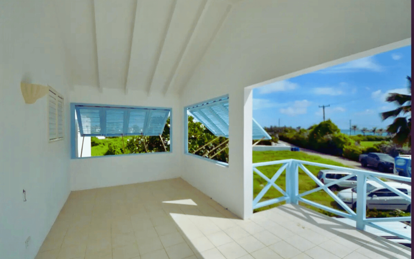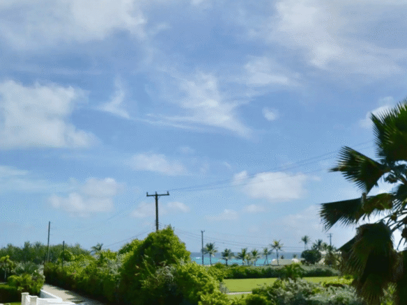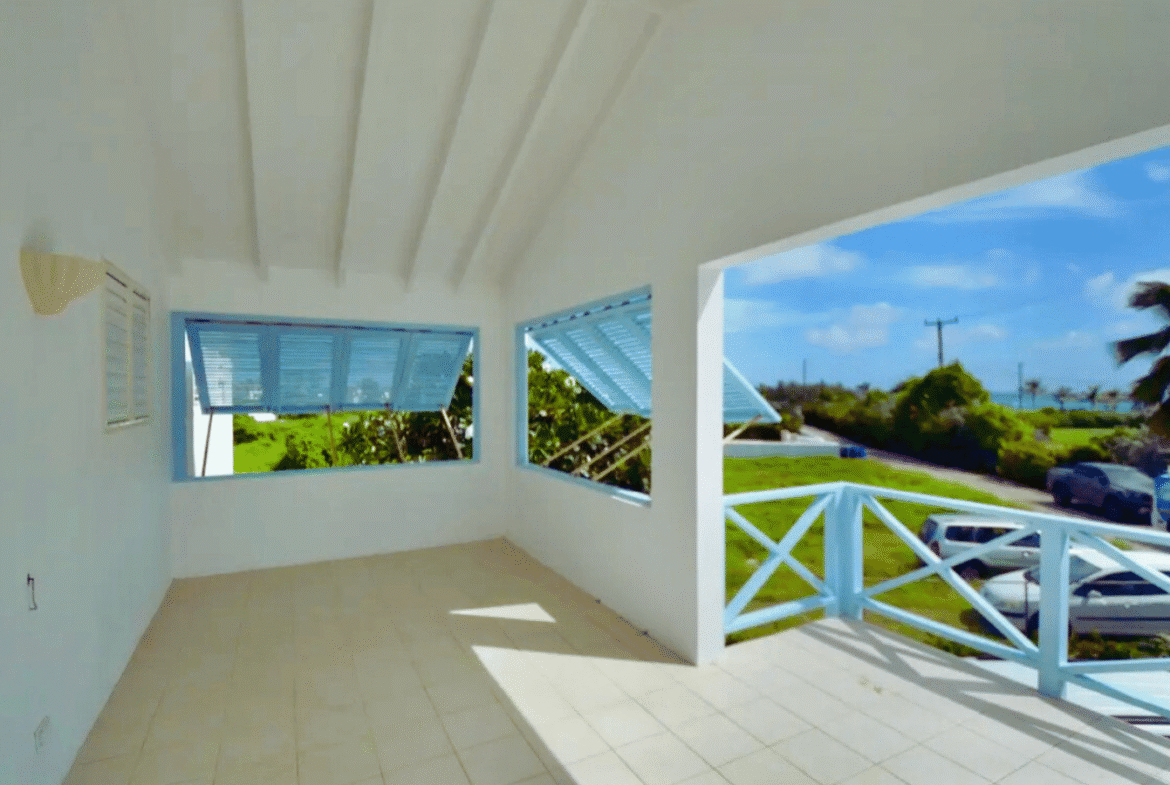 Large openings lead to a generous patio, partially shaded with Bahama shutters, where you can sip your morning coffee while watching the ocean shimmer in the distance.