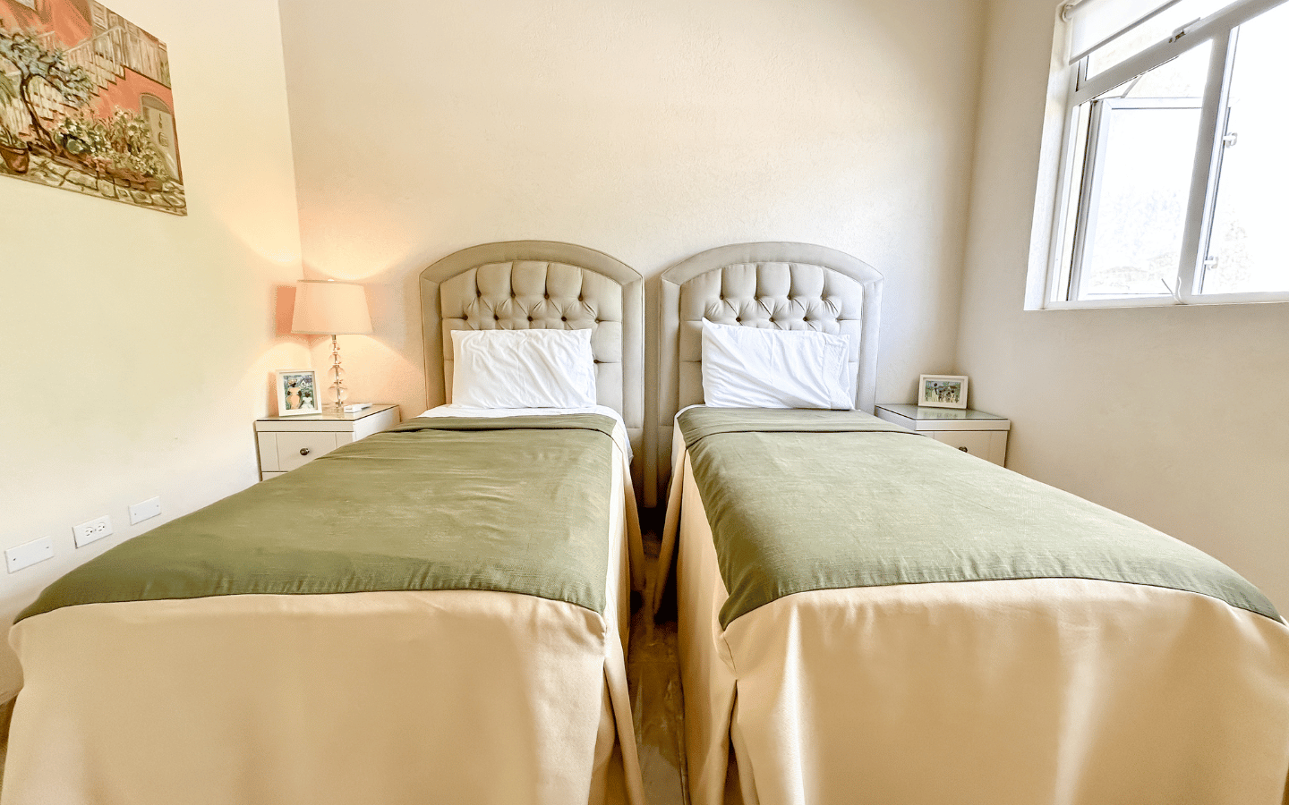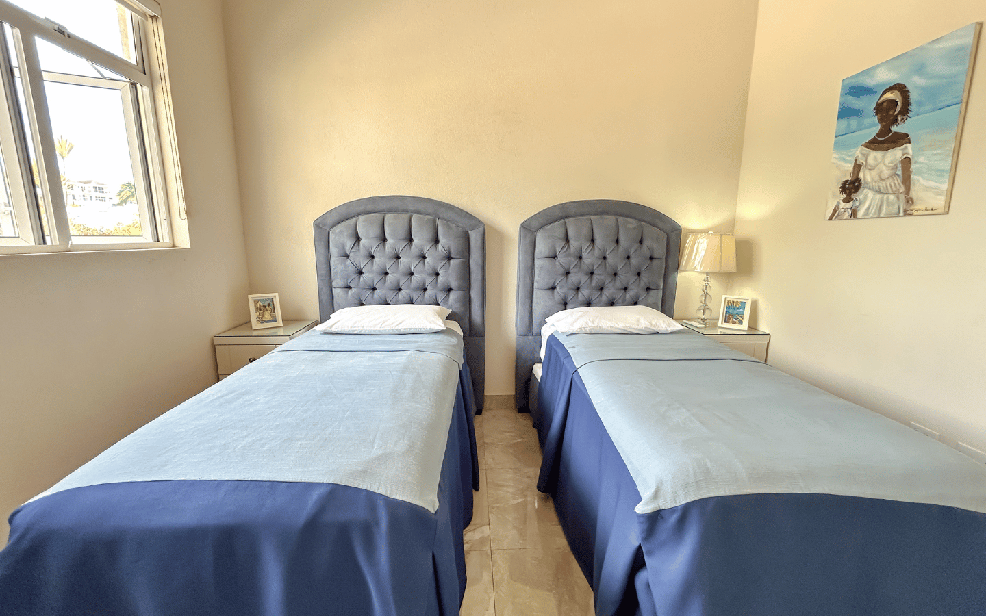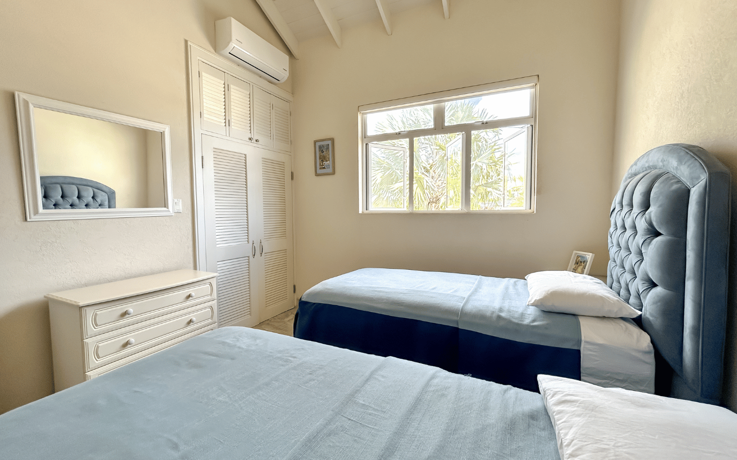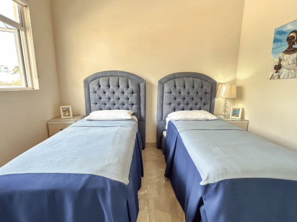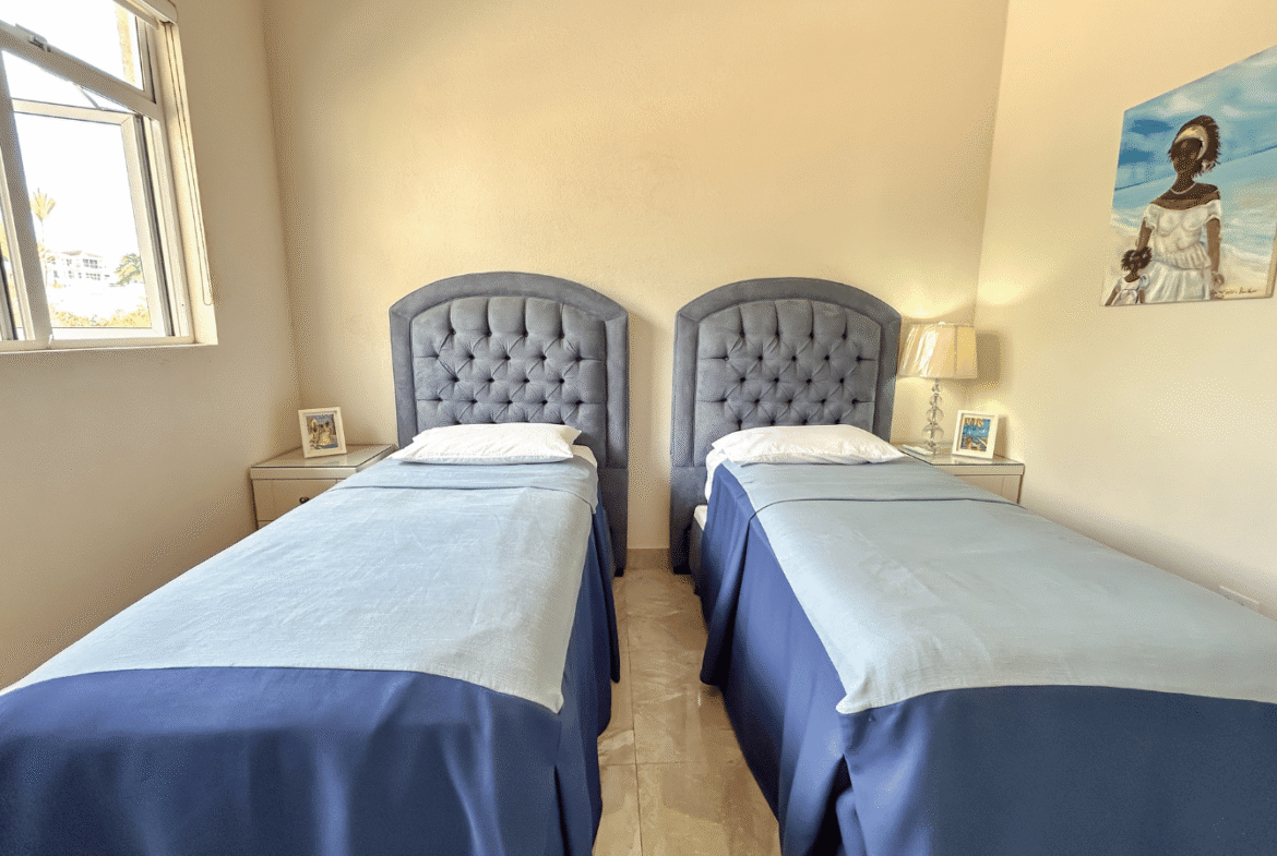 The master suite enjoys elevated sea views and a peaceful ambiance, while two well-appointed guest bedrooms offer flexibility for family living or hosting visitors. Additional conveniences include a powder room, dedicated laundry area, and ample storage throughout the home.