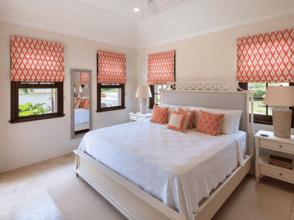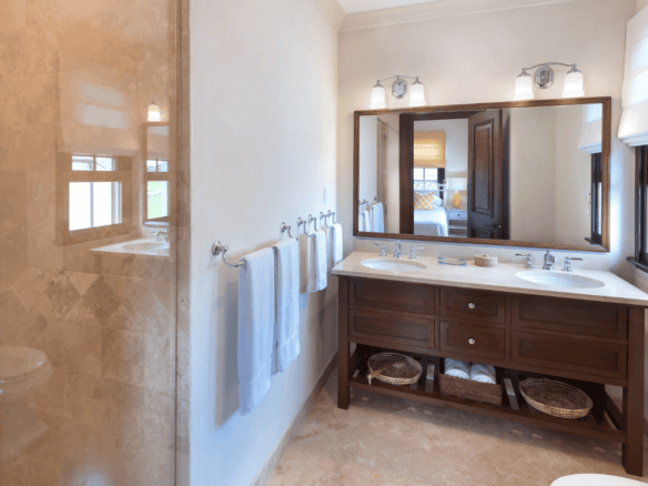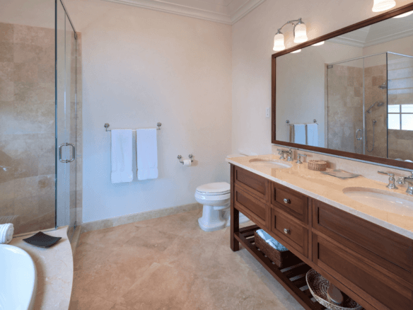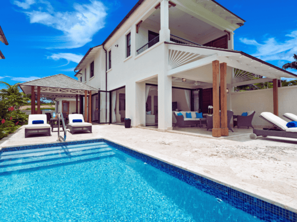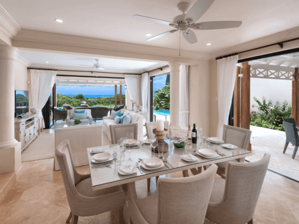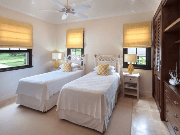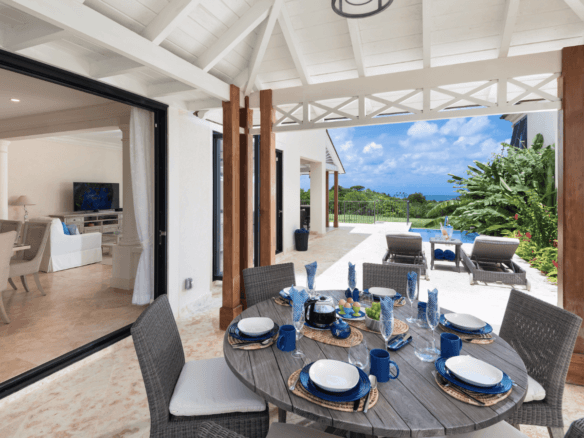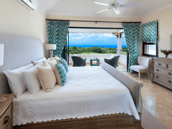 One of the bedrooms is situated on the ground floor, making it an ideal choice for those with mobility concerns or visiting guests to beautiful Barbados. The remaining two ensuite bedrooms, including the luxurious master suite, are located on the top floor. The master suite offers panoramic views of the golf course and ocean beyond, a walk-in closet as well as a private soaker tub in this lavish bathroom.