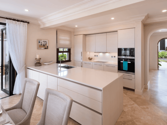 Featuring three bedrooms and three and a half bathrooms, this townhome is located on the top ridge of the prestigious Apes Hill Golf Club. The main floor comprises an open-plan living area where the kitchen, dining and living room flow seamlessly out to a refreshing pool deck. The kitchen is equipped with premium Miele appliances, including a convection oven, ceramic cooktop, two fridges, two freezers, a wine chiller and a microwave. A generously-sized washing machine and dryer complete this well appointed property.